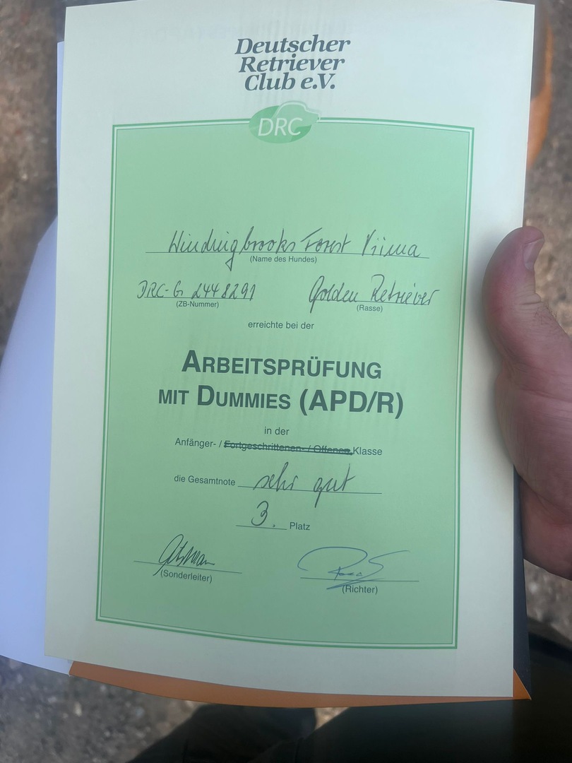 Flint hat all seine Dummys nach Hause gebracht und konnte somit den Einzel-WT mit sehr gut bestehen, super!