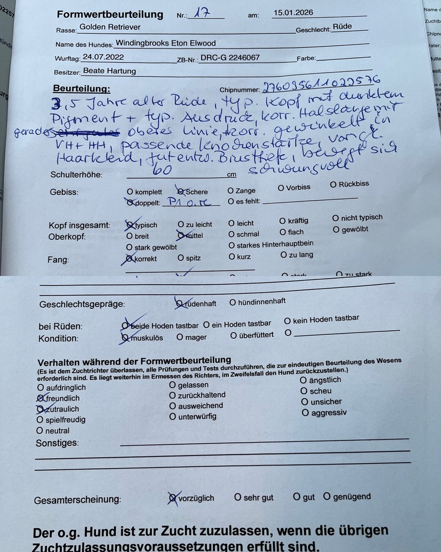 2,5 jähriger Rüde, sportl. Typ, typ. Kopf mit rassetyp. Pigment, korr. anges. Behänge, korr. Halslänge mit oberer Linie, vorzgl. Fellanlage, korr. gewinkelt, korr. Knochenstärke, bewegt Schwungvoll, bereits ausgepr. Brusttiefe, freundliches Wesen.