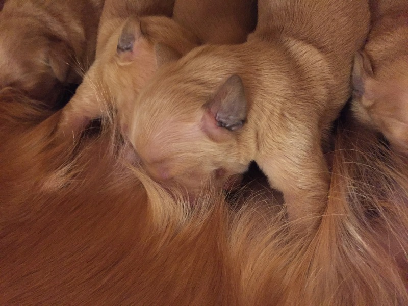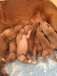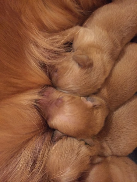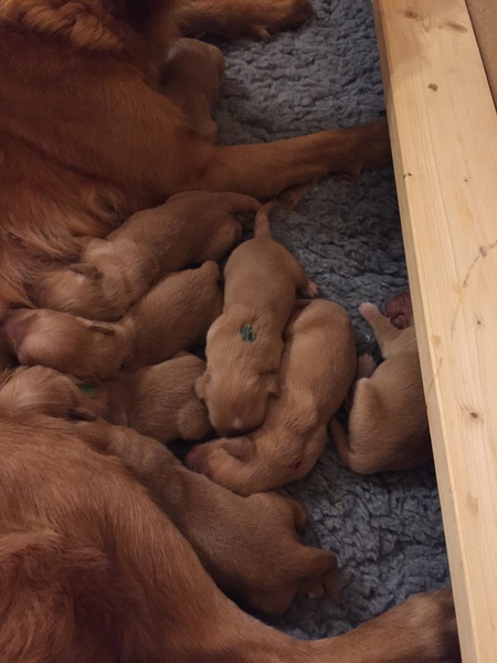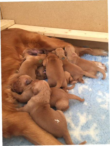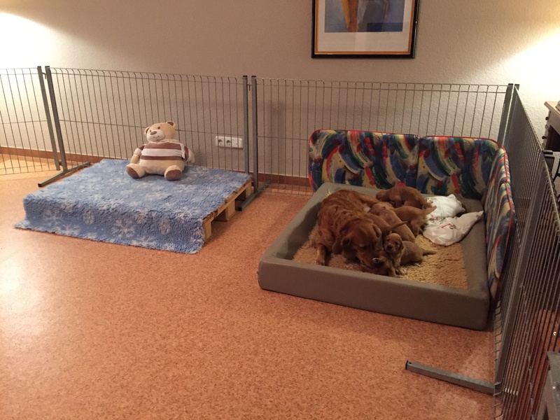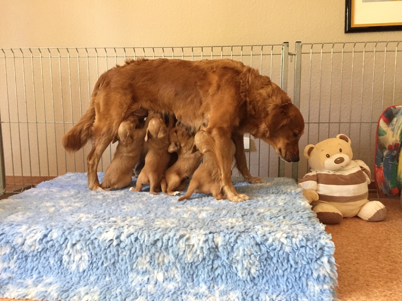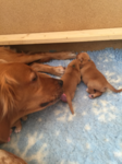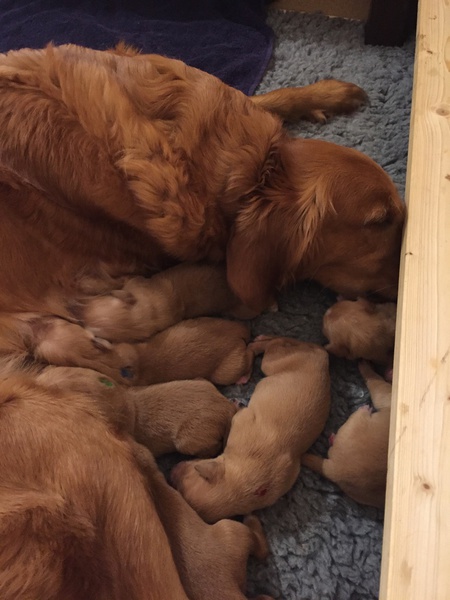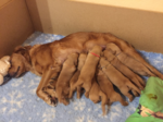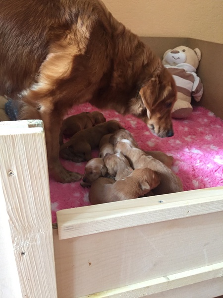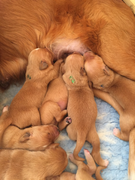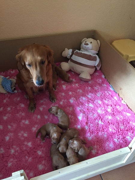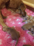 Mutter und Kindern geht es gut! Bei den Welpen beginnt die Pigmentierung! Day hat jetzt großen Hunger und bekommt 4x am Tag Futter!