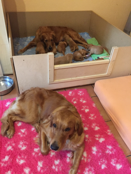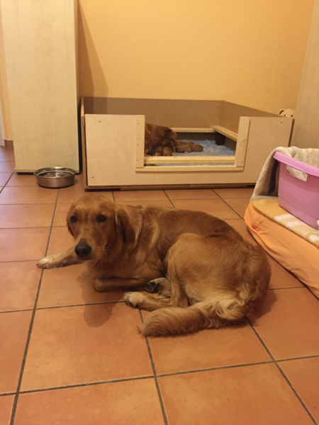 Ava möchte am liebsten mit in die Wurfkiste, muss aber davor warten! Clara findet die kleinen Schreihälse eher nervig und bleibt lieber im Wohnzimmer wenn sie da ist!