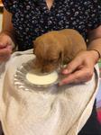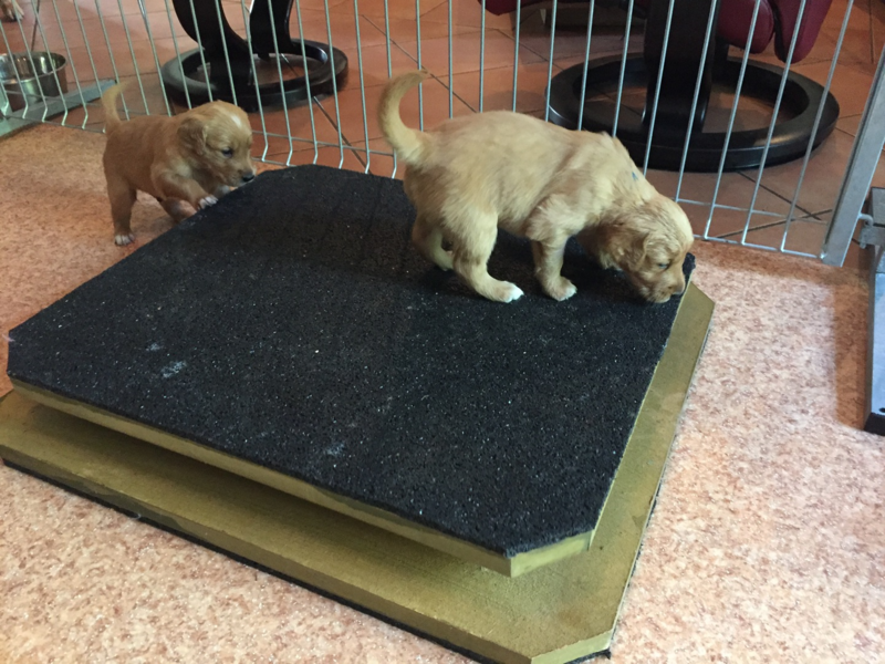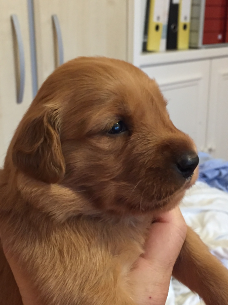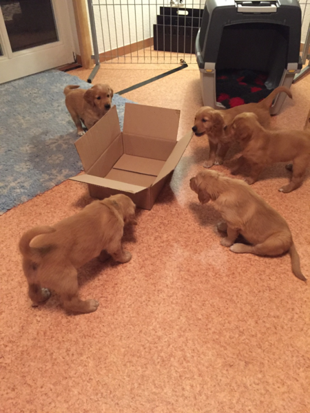 Anfang der Woche sind die Welpen in den großen Auslauf im Wohnzimmer umgezogen. Dort gab es viel zu erkunden. Auch ihre zweite Wurmkur haben sie bekommen. Diese Woche wurden die Welpen auch an Welpenmilch und Welpenfutter herangeführt! Die abendliche Mahlzeit aus Welpenmilch und Welpenfutter wird laut schmatzend verputzt.